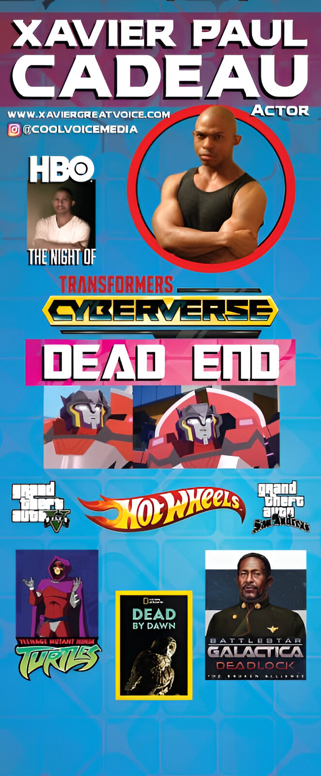 Xavier “XMAN” Paul Cadeau is an iconic voice actor who voices the legendary Transformers character “Dead End” in addition to Malik Melkie in “Jade Armour” and several characters in Grand Theft Auto Rockstar Video games. From ESPN to HBO Sports,he’s been a prominent household voice across the country including LIVE announcing for “LIVE with Kelly & Ryan” on ABC.